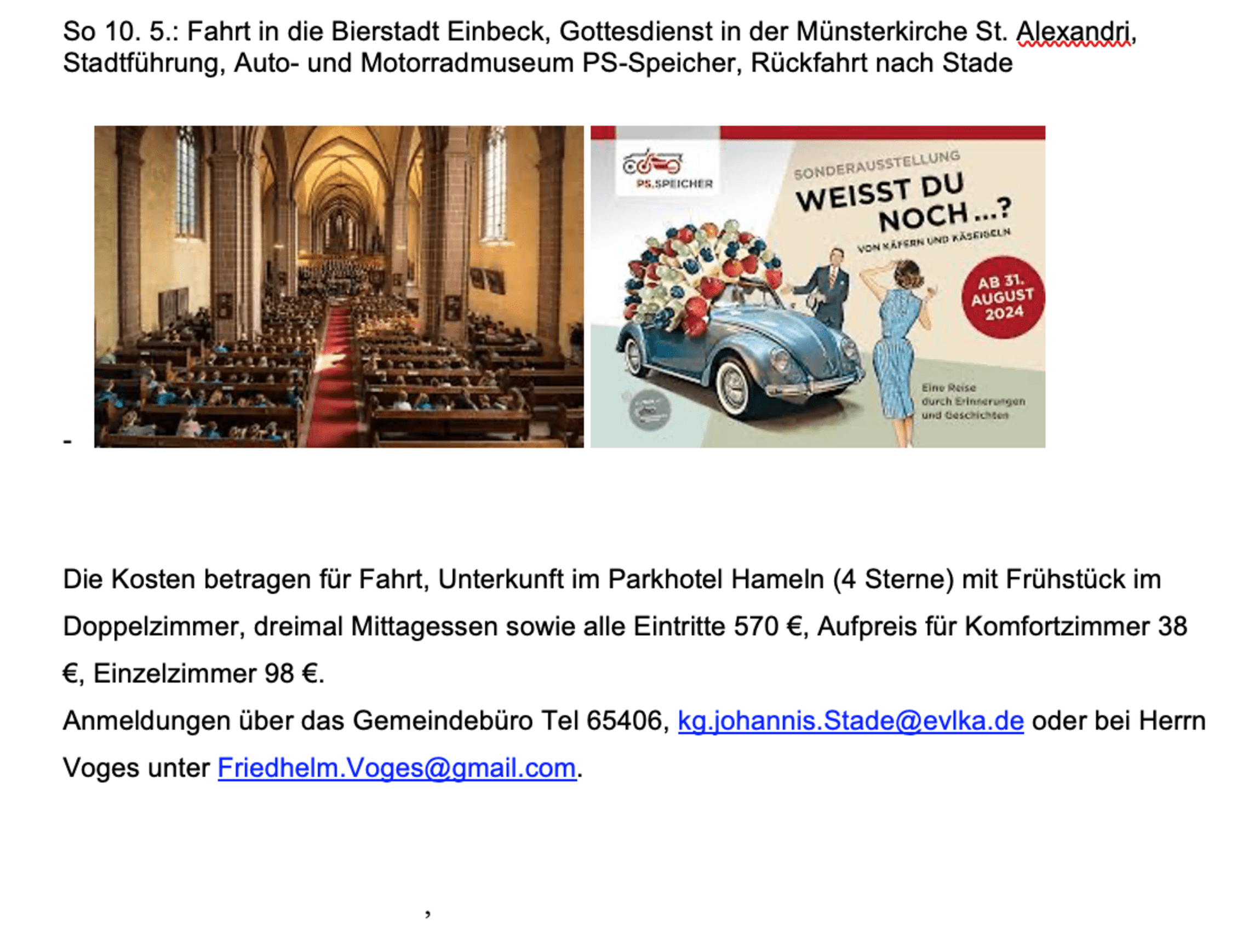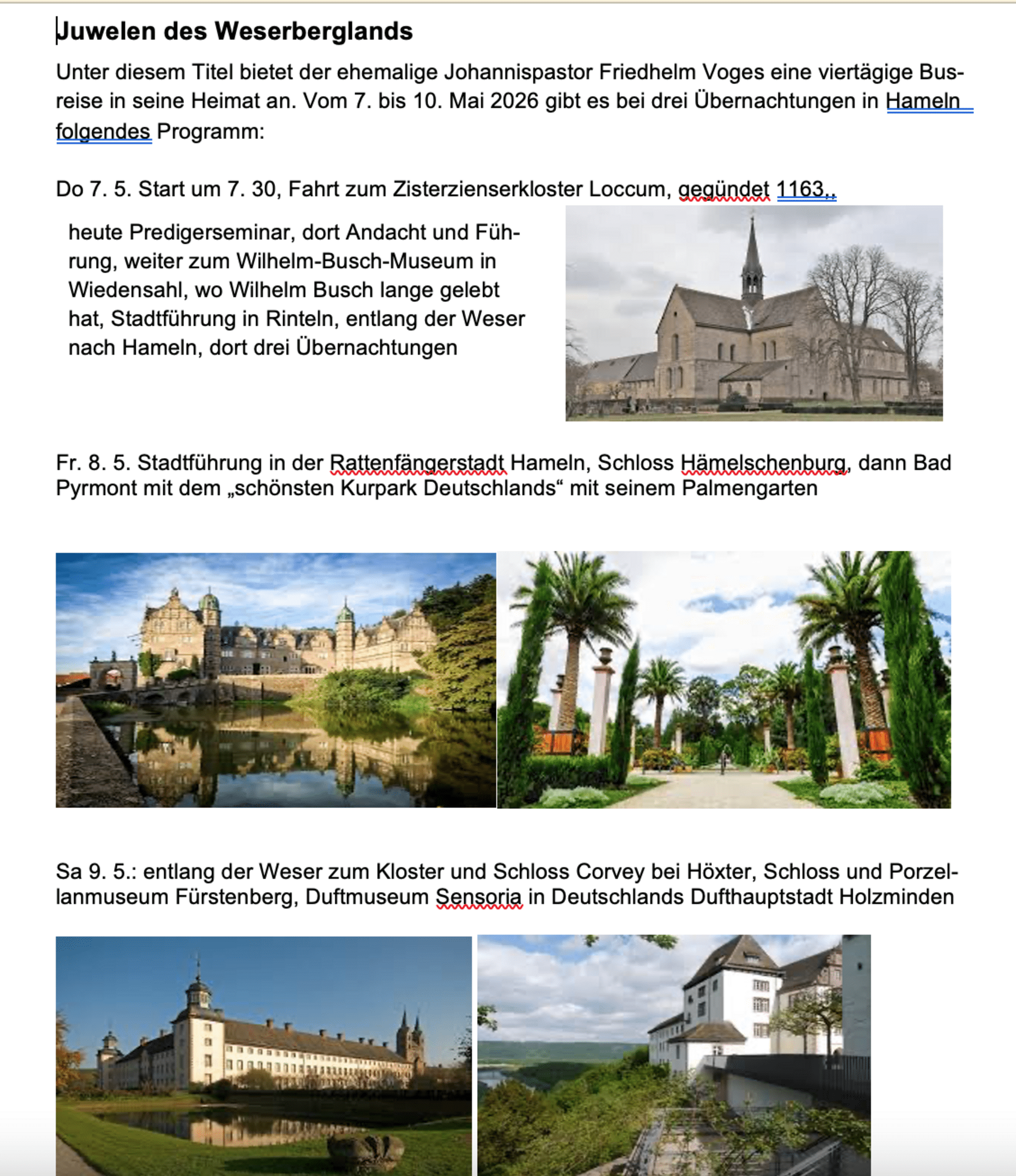 Fahrt mit Sup.i.R. Dr. Friedhelm Voges zu den Juwelen des Weserberglandes vom 07. bis 10. Mai 2026. Infos im Text und als PDF-Ausdruck, siehe unten.