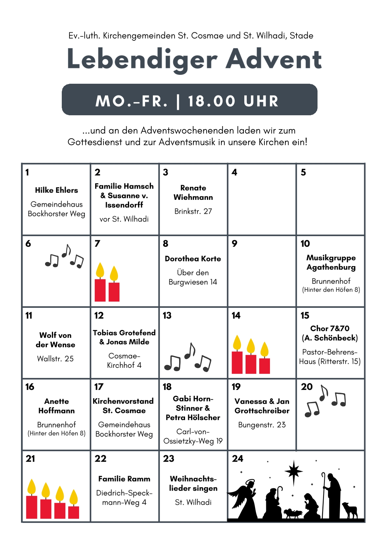 Im Advent gehen die Türen auf – nicht nur an den Schoko-Adventskalendern, sondern auch in unseren Gemeinden. Herzliche Einladung zum gemeinsamen Adventskalender der Kirchengemeinden St. Cosmae und St. Wilhadi in Stade!